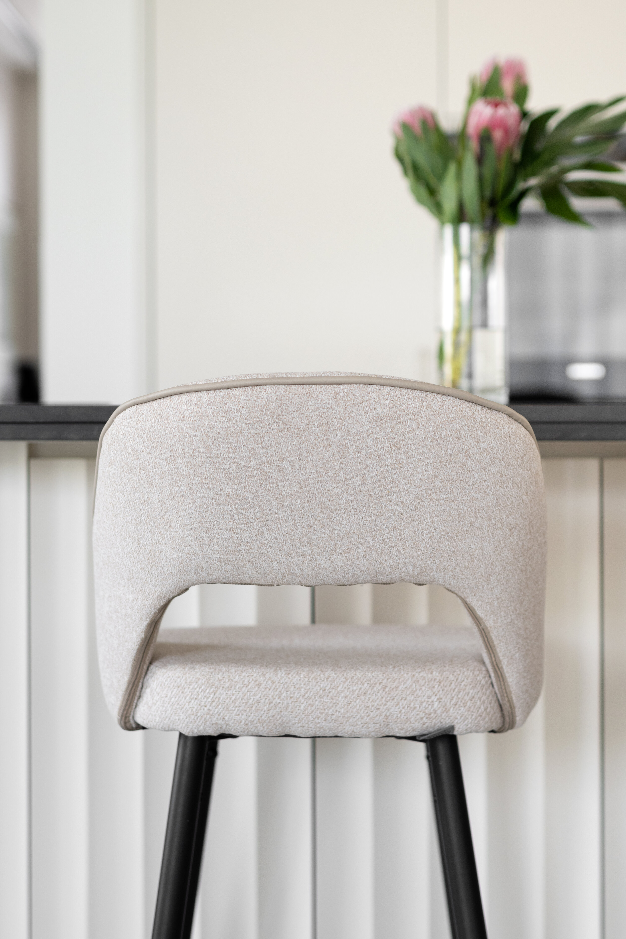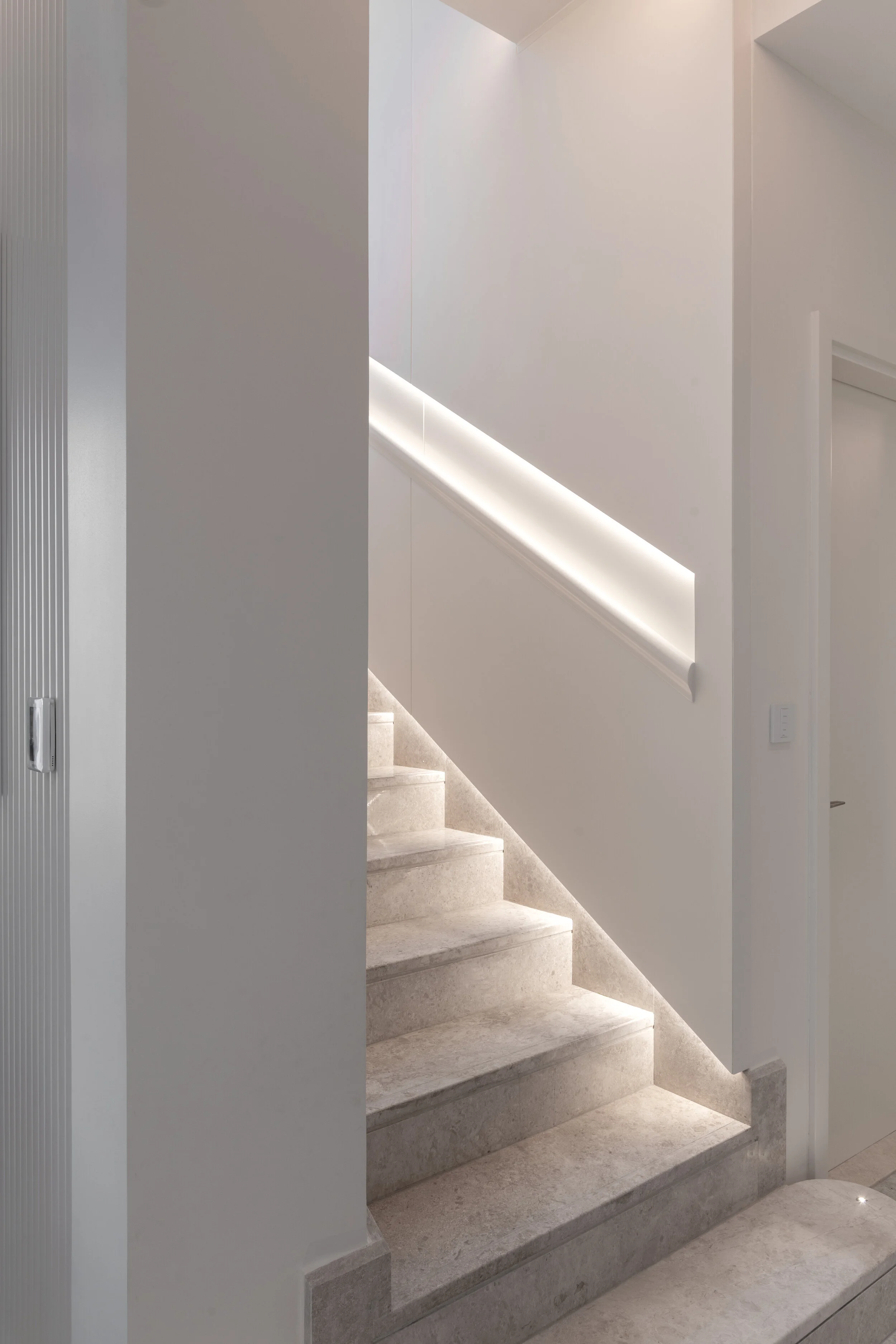 The spacious, modern and lavish result of Ghayth Maatouk’s Interior Design Studio is the touch of an expanded living area, an open island kitchen, and an integrated TV room. Elevated touches of renovation such as newly added rails and lighting on the stairs resulted in a full transformation.