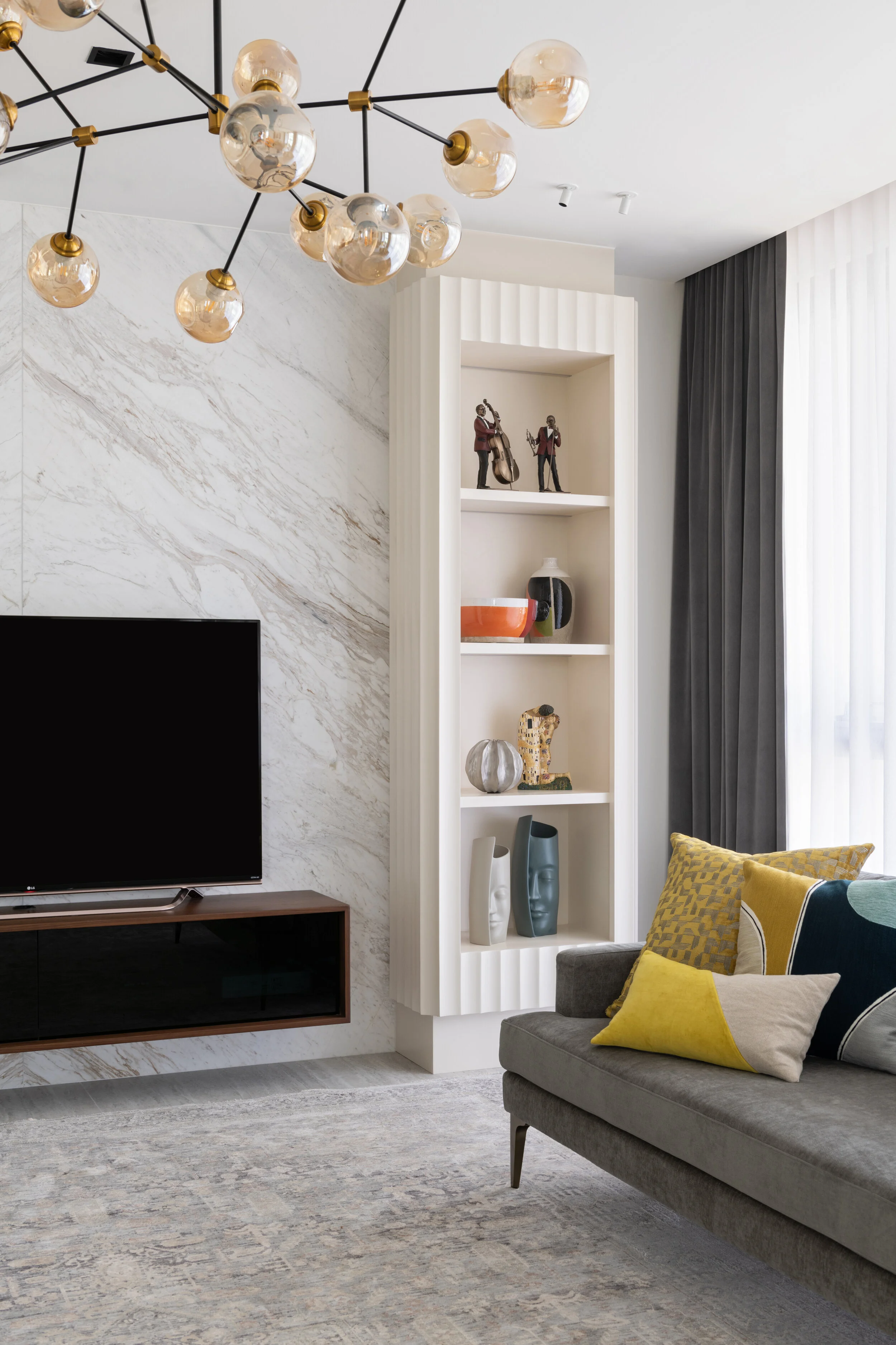 The landscape looked like an elongated terrace adjacent to the living room, an indoor-to-outdoor feel when the sliding doors open, and a medley of marble equating to a unique aesthetic that wows with every entrance.